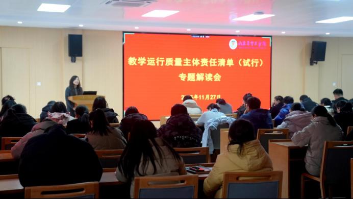 2025年11月27日下午,《山东华宇工学院教学运行质量主体责任清单(试行)》(以下简称《责任清单》)专题解读会在12号教学楼学术报告厅召开。教务处处长助理闵凡萍主持会议并作专题解读,各教学单位分管教学工作负责人、教务科科长、教研室主任、实验中心主任及教学秘书等100余人参会。